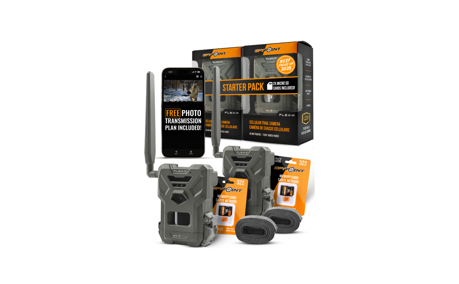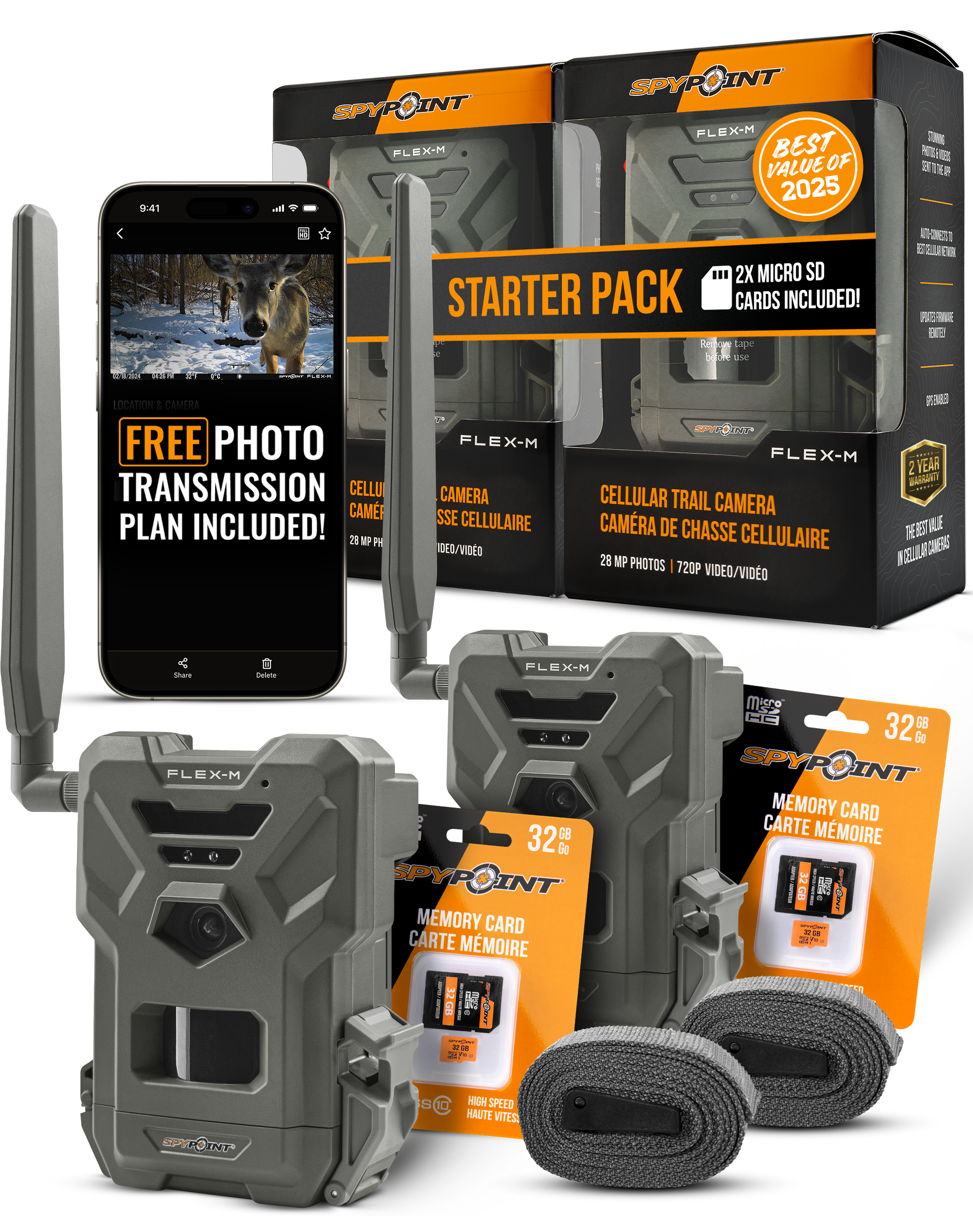 - UNBEATABLE VALUE: Get premium cellular capabilities at an unbeatable price with the SPYPOINT FLEX-M Cellular Trail Camera. Setup is a breeze with mobile activation and on-camera buttons for easy formatting of the microSD card and test photo capture. Plus, ensure continuous operation with extended autonomy by pairing with our compatible solar panels (sold separately). The Starter Pack includes an SD card, which is necessary for camera operation.